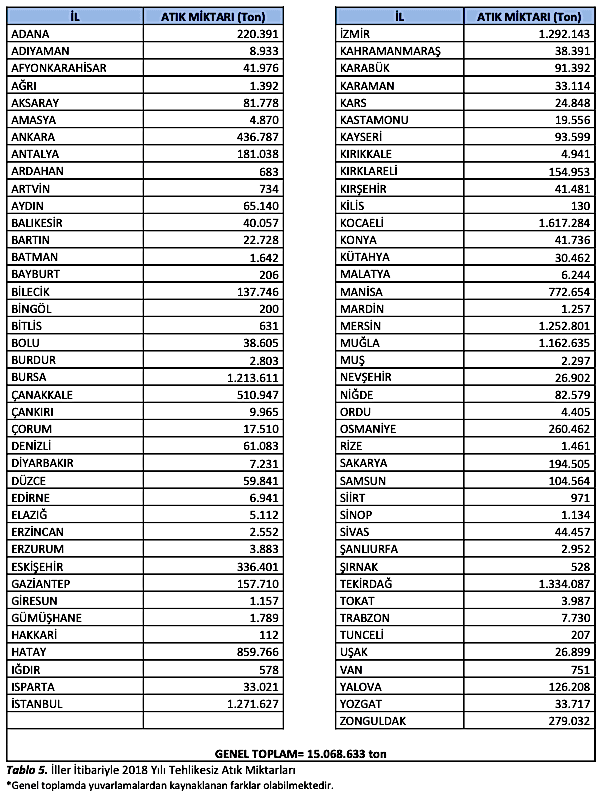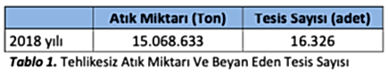 2018 yılı için Türkiye genelinde Tehlikesiz Atık Miktarı toplamı 15.068.633* ton olarak belirlenmiştir.