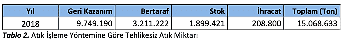 2018 yılında geri kazanım amacıyla atık işleme tesislerine gönderilen atık miktarı 9.749.190 ton, bertaraf edilmek üzere atık işleme tesisine gönderilen atık miktarı ise 3.211.222 ton olarak gerçekleşmiştir. Yılsonu itibariyle tesiste stok olarak tutulan tehlikesiz atık miktarı 1.899.421 ton, ihraç edilen tehlikesiz atık miktarı ise 208.800 ton olarak gerçekleşmiştir.
