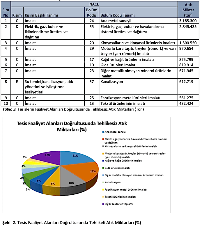 TABS’a yapılan beyanlar doğrultusunda en çok tehlikesiz atık oluşturan 10 sektör ve toplam tehlikesiz atık miktarları aşağıdaki tabloda verilmektedir. Sektör bilgisi için NACE Rev.2 altılı ekonomik faaliyet sınıflaması kullanılmıştır. 2018 yılında 81 adet NACE bölüm kodunda faaliyet gösteren tesisler beyan gerçekleştirilmiştir. En yüksek atık oluşumunun 3.185.300 ton ile imalat sektörü/Ana metal sanayii bölümünde yer alan tesislere ait olduğu görülmektedir. En yüksek tehlikesiz atık oluştuğu beyan edilen 10 faaliyet, toplam tehlikesiz atık miktarının %87’sini oluşturmaktadır.